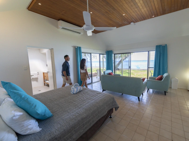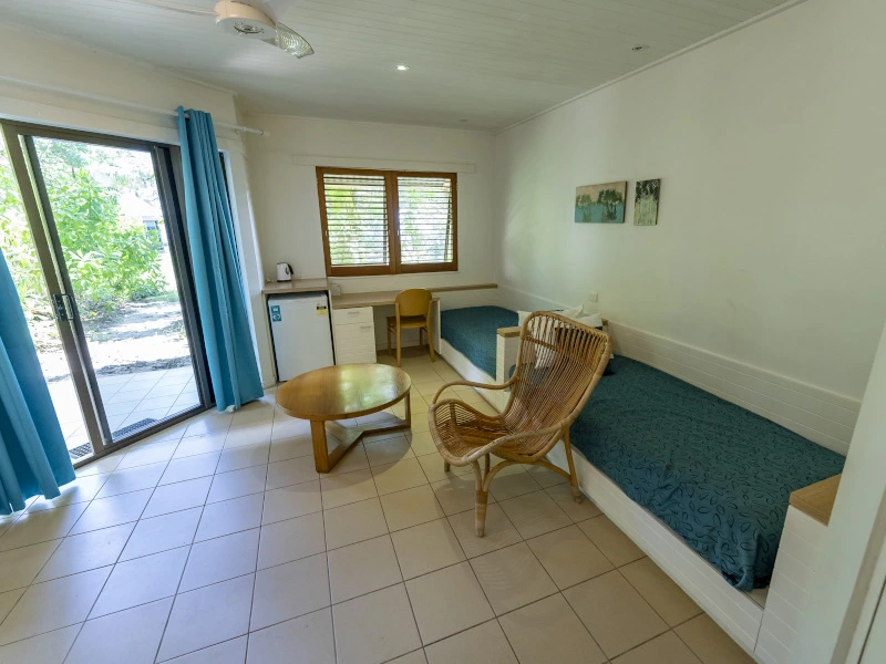 Je overnacht in een comfortabele kamer met een terras dat uitkijkt op het prachtige rif. Wil je je als Robinson Crusoe voelen? Vraag ons naar een overnachtingspakket op het kleine en romantische Wilson Island in een glamping tent.
