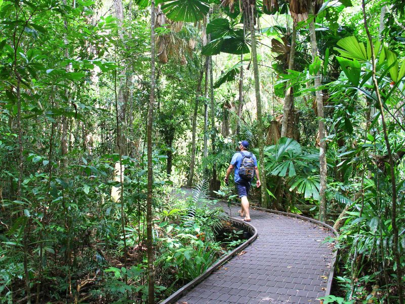 Ten noorden van Cairns ligt Daintree National Park, waar het regenwoud letterlijk tot aan zee reikt. De bomen zijn metershoog, de lucht is vochtig en overal hoor je vogels en krekels. Wandel over houten paden door de jungle of vaar over de Daintree River, waar je krokodillen in hun natuurlijke omgeving kunt zien. Aan de kust ligt Cape Tribulation, waar de jungle overgaat in koraalstrand. Het is een van de weinige plekken op aarde waar twee UNESCO-werelderfgoederen elkaar raken: het regenwoud en het rif.