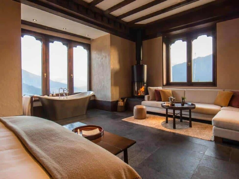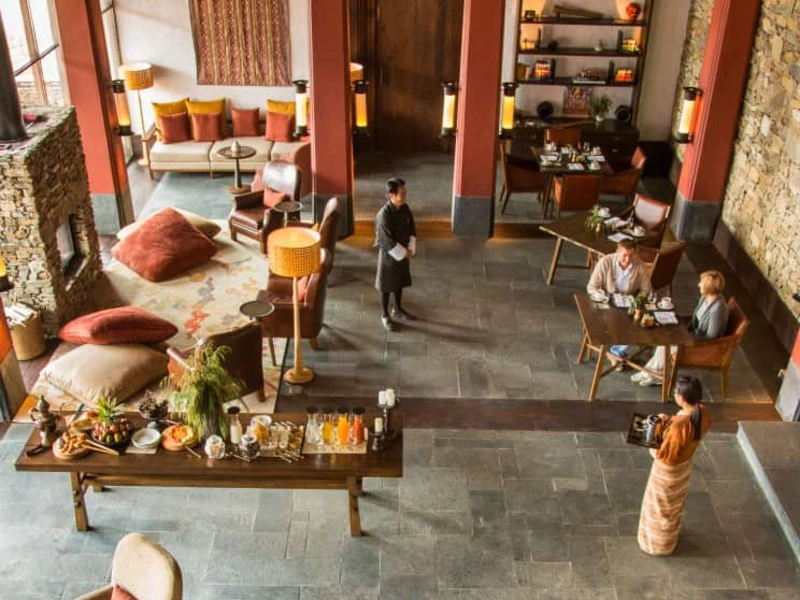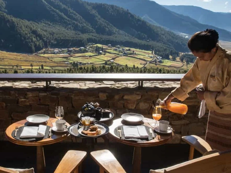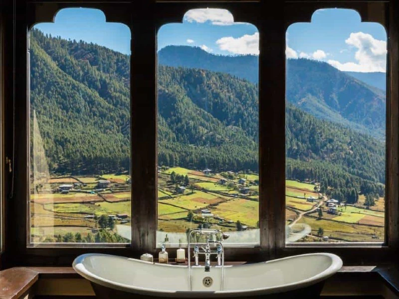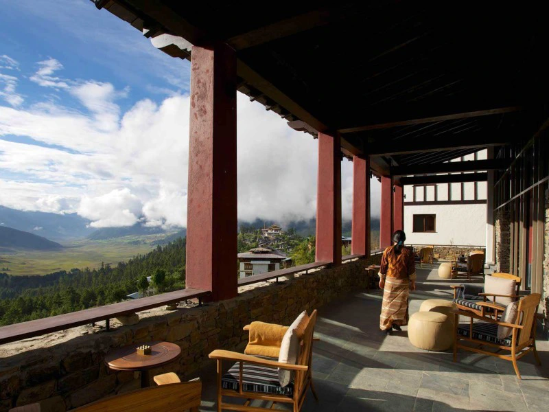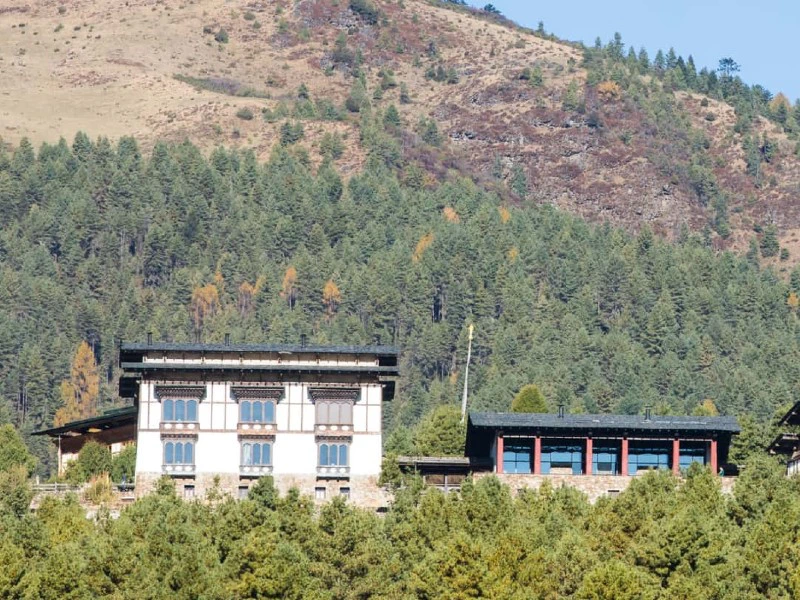 Na een wandeling door de vallei brengt de chauffeur je naar je hotel in de vallei. Het hotel met uitzicht op de vallei heeft een typische Bhutanese architectuur met pasteltinten, houtsnijwerk en aparte vormen waardoor het meer wat weg heeft van een fort dan een hotel.