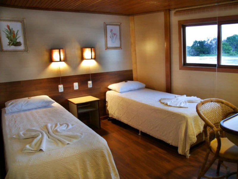 Tijdens deze reis verblijft u aan boord van een typische platbodemboot uit de Amazone. Geen cruiseschip zoals je het misschien kent van de Rijn, maar speciaal uitgerust om op de Amazone te varen. Vergeleken met de ‘reguliere serviceboten’ die de Amazone op en af varen en die vooral beschikken over hangmatten, is je verblijf comfortabeler: je slaapt in hutten met airconditioning, uitgerust met eigen douche/toilet en warm water. Verder is de ruimte aan boord beperkt: een overdekte ruimte waar je eet en die dienst doet als ‘salon’ en een zonnedek met ligstoelen. Het personeel in de kombuis zorgt voor uitstekende maaltijden (inbegrepen). Er zijn twee motorkano’s die worden gebruikt voor rivierexcursies. Deze worden begeleid door een enthousiaste Engelssprekende gids.