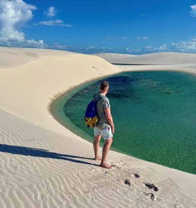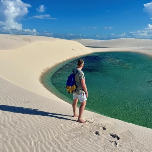 Met wat extra gas rijdt de terreinwagen soepel een hoge duin op, waar je waarschijnlijk al wat andere wagens ziet staan. De slippers gaan uit en alles wat je niet mee wilt nemen kan in de auto blijven liggen. Op blote voeten wandel je een stukje verder naar Lagoa Azul. Hier zie je Braziliaanse families met een koelbox aan de kant liggen en worden er foto’s gemaakt bij de schommel in het water. De Brazilianen blijven hier de hele dag hangen alsof het de lokale badplaats is, maar wij lopen verder het Lençóis Maranhenses park in.