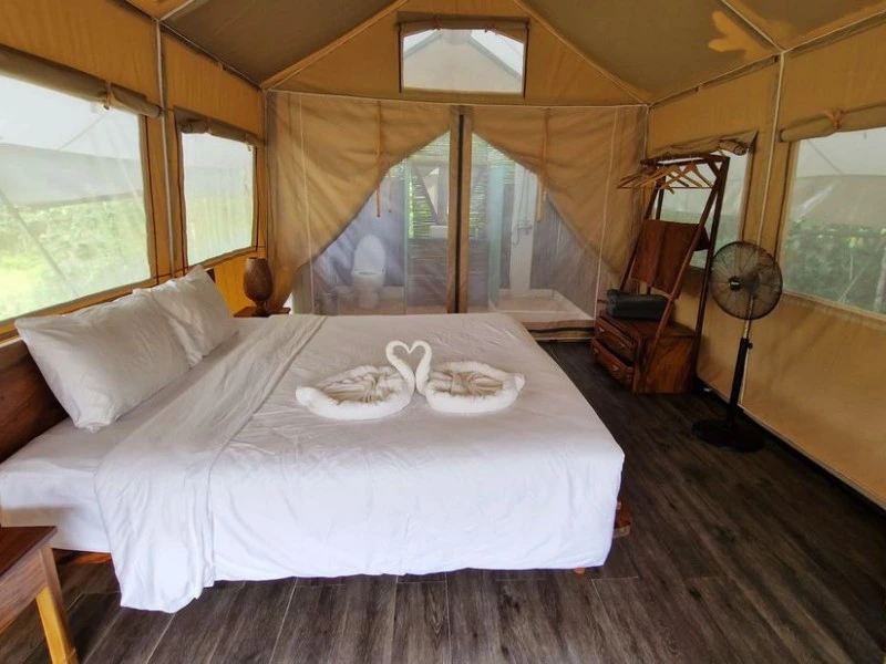 In de vroege namiddag kom je aan in Trapeang Rung, een klein dorpje aan de rand van het Botum Sakor National Park. Met de eigen longtailboot van het camp verlaat je de bewoonde wereld en dring je steeds verder door in de dichte jungle van het Kardemomgebergte. Cardamom Tented Camp, gelegen in de vlakke graslanden direct aan de Preak Tachan-rivier, heeft zich op een duurzame manier gericht op ecotoerisme. De tenten zijn eenvoudig maar comfortabel ingericht en gaan harmonieus op in het landschap. Ze hebben een eigen badkamer en zijn uitgerust met een ventilator.