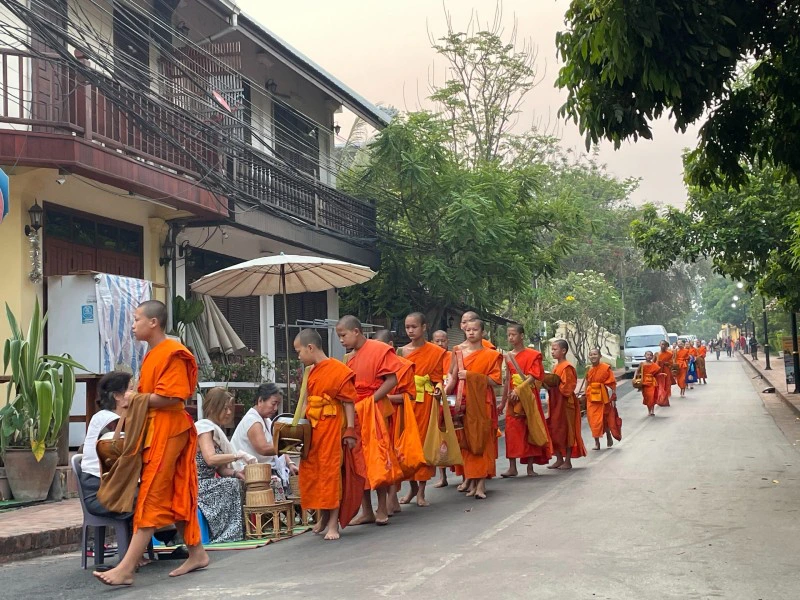 Ben je een vroege vogel, dan is het bijzonder om een ritueel bij te wonen dat zich elke ochtend bij zonsopkomst voordoet in Luang Prabang; namelijk de processie van de monniken. Gelovige Laotianen schenken op hun knieën en met gebogen hoofd rijst en fruit aan de monniken. Langzaam trekt de ochtendmist op en zie je de sliert monniken, gekleed in de oranje gewaden, voorbij lopen om de aalmoezen te verzamelen.