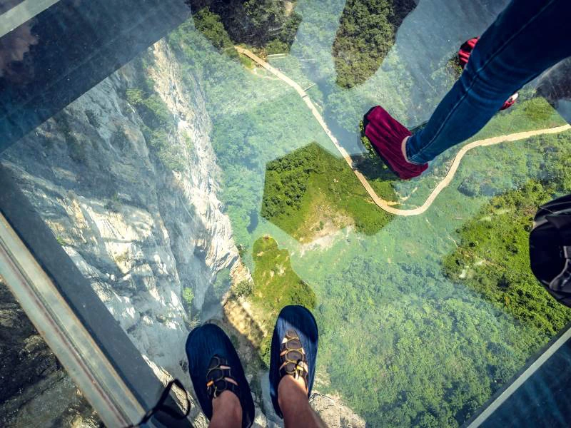 Zin in een ander soort avontuur? In de buurt van Wulingyuan ligt de Grand Canyon van Zhangjiajie, waar je de kloof kunt oversteken via een indrukwekkende glazen brug.