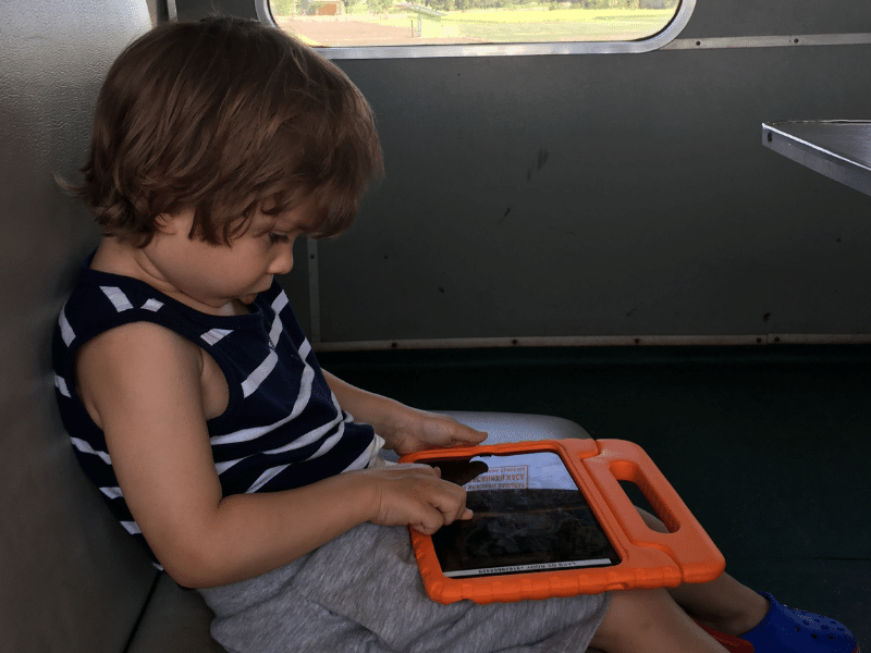 ‘’We proberen altijd zoveel mogelijk de schermtijd verminderen, maar soms heb je gewoon een wat langere autorit voor de boeg. Ik zorg daarom altijd dat ik een goedgevulde tablet bij me heb. Van tevoren download ik een aantal filmpjes, liedjes en luisterboeken zodat we die offline bekeken kunnen worden. Bij de bieb kijk ik altijd of ik een (voorlees)boek kan vinden over het thema van het land. Ook vind ik de autobingo heel leuk.’’