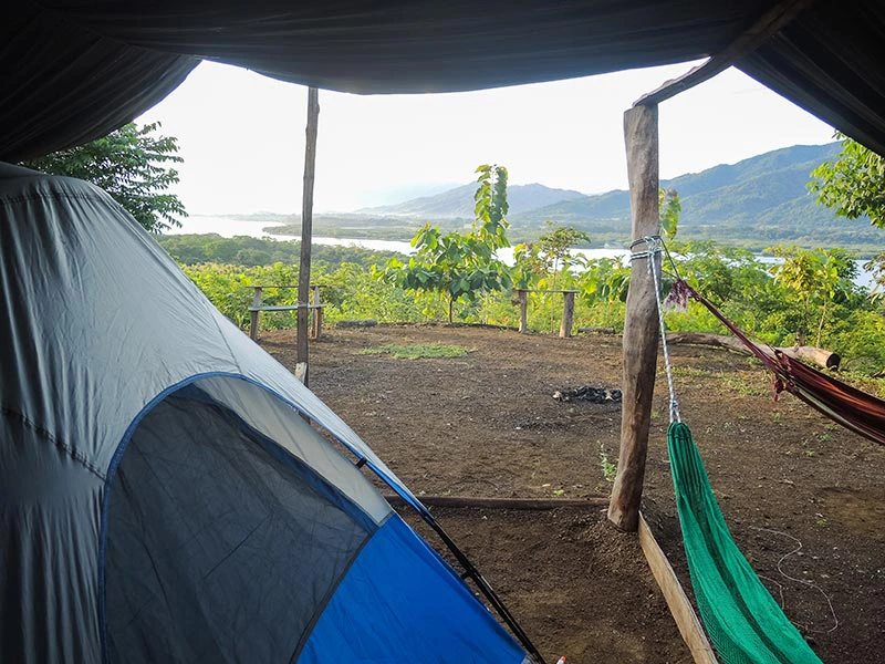 Omdat er geen toeristen komen is er ook geen hotel te vinden op Isla Venado. Ronaldo runt een kleine camping, maar speciaal voor ons heeft hij een prachtig plek boven op de berg vrijgemaakt waar we kunnen wildkamperen. Het is een kwartier klauteren de berg op, maar het uitzicht vanaf hier is adembenemend. Je kijkt uit over het eiland en de Golf van Nicoya.