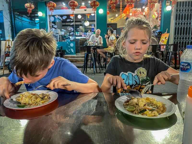 Als het om eten gaat, zijn wij een grote fan van de Thaise keuken. We hebben genoten van verschillende curry’s, zoals de milde Massaman Curry en de heerlijke Penang Curry. Gebakken rijst stond ook regelmatig op het menu. Voor de kinderen was de mango met kleefrijst en kokosmelksaus een absolute favoriet. Overal was vers fruit verkrijgbaar. En voor de iets kritischere eters waren er altijd wel patatjes te vinden. We hebben ook genoten van heerlijk en goedkoop eten wat je op straat kan halen, zoals pannenkoekjes met banaan en chocoladesaus, en een niet al te pittige Pad Thai die voor iedereen goed te doen was.