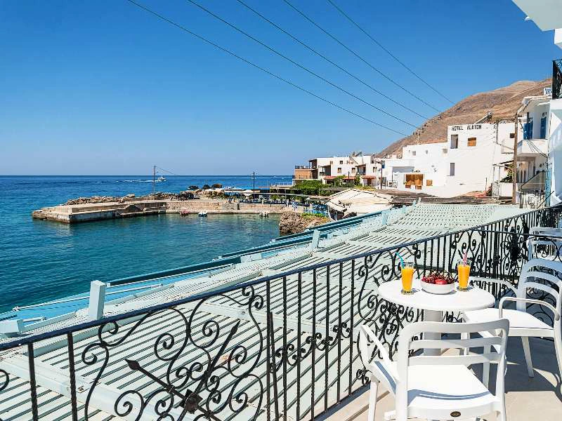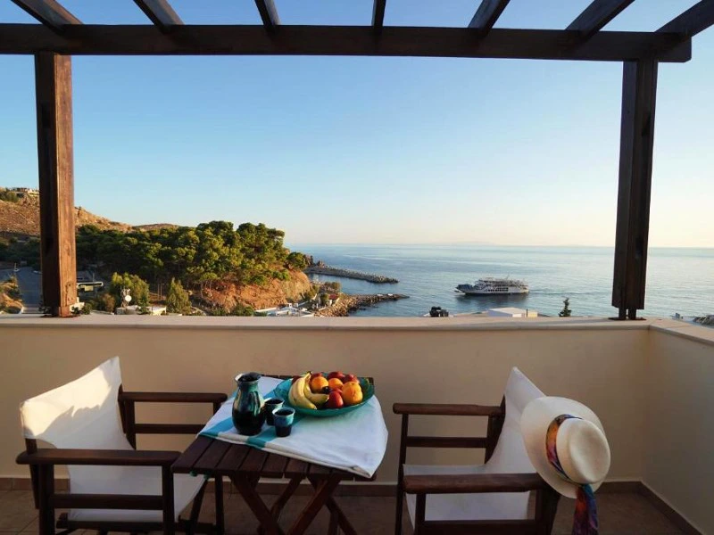 De weg naar Chora Sfakion gaat op z’n Grieks over bergen en langs kloven. Je ziet in de verte de Lefka Ori bergen en met een beetje geluk spot je in het voorjaar de witte toppen. Om je heen zie je olijfbomen en ruik je de geur van dennen en tamarisken. Dat geeft echt zo’n vakantiegevoel. En al helemaal als je de zee weer voor je ziet, wanneer je het dorp binnen rijdt. Je overnacht in een gezellig, klein hotel (zonder zwembad) met balkon en uitzicht op zee. Waarom we voor dit plekje kiezen? Je wandelt zo naar de twee belangrijke straten, de tavernes en het strand. Plus: je kan bij het restaurant van je hotel heerlijk eten. Het uitzicht krijg je als cadeau erbij. Liever een hotel met zwembad? Kijk dan onderaan de pagina. Goed om te weten: je parkeert je auto nét buiten het dorp; het gebied waar je hotel ligt is autovrij.