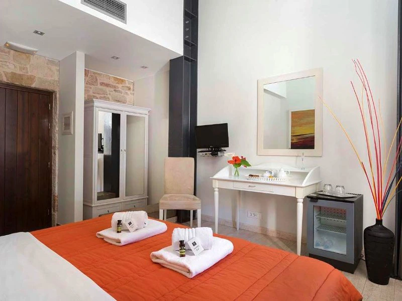 Ook in Vathy, maar dan met net wat meer luxe en details. Ons upgrade hotel ligt aan de overzijde van de baai, verstopt in een smalle straat. Eenmaal binnen kijk je je ogen uit. De inrichting is áf en vanaf het zwembad kijk je uit over de zee en over Vathy. De kamers zijn ingericht met oog voor detail en zijn heel ruim. Tavernes vind je op loopafstand terwijl je hier in alle rust kunt genieten.