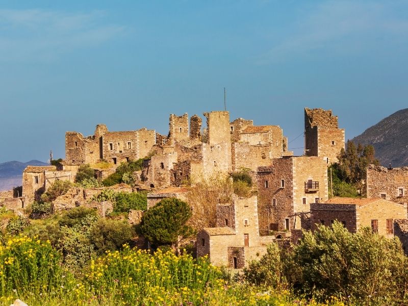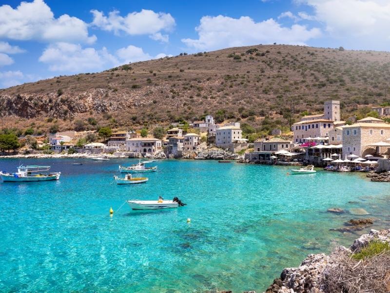Begin ontspannen op Kalogria Beach of het intieme Foneas-strandje, verscholen tussen hoge rotsen. Heb je zin om wat rond te rijden, dan is Areopoli een mooi vertrekpunt: een levendig stadje met smalle steegjes, stenen huizen en kleine pleintjes waar je neerstrijkt voor een koffie. Van daaruit kun je doorrijden naar Vathia, misschien wel het meest iconische dorp van de Mani, waar de hoge stenen woontorens boven het heuvelachtige landschap uitsteken en je meteen ziet waarom dit een van de meest gefotografeerde plekken van de regio is. Verder naar de kust ligt Limeni, een charmant havenplaatsje met huizen van natuursteen en terrassen die pal aan het helderblauwe water liggen.