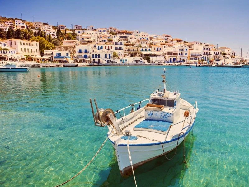 De Cycladen duur en toeristisch? Niet op Andros. Dit op één na grootste eiland ligt op slechts twee uur varen van Athene en wordt vooral bezocht door de Grieken zelf. Het eiland is ideaal als je van wandelen houdt. Het heeft inmiddels 160km schoongemaakte en goed aangegeven wandelpaden. Andros is een stuk groener dan de andere eilanden, je vindt er dan ook tal van waterbronnen en bergstroompjes.
