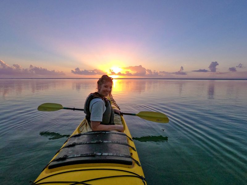 Vandaag sta je tegelijk met de zon op. Nog voor het ontbijt stap je met een gids in de kajak voor een tocht over de lagune. Het water is spiegelglad en de kleuren veranderen langzaam met het ochtendlicht, een magisch begin van de dag.
