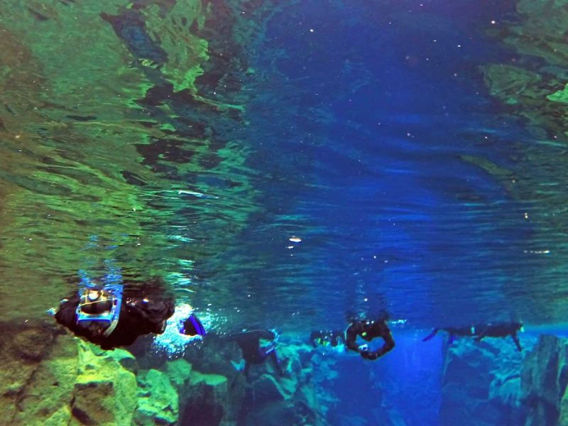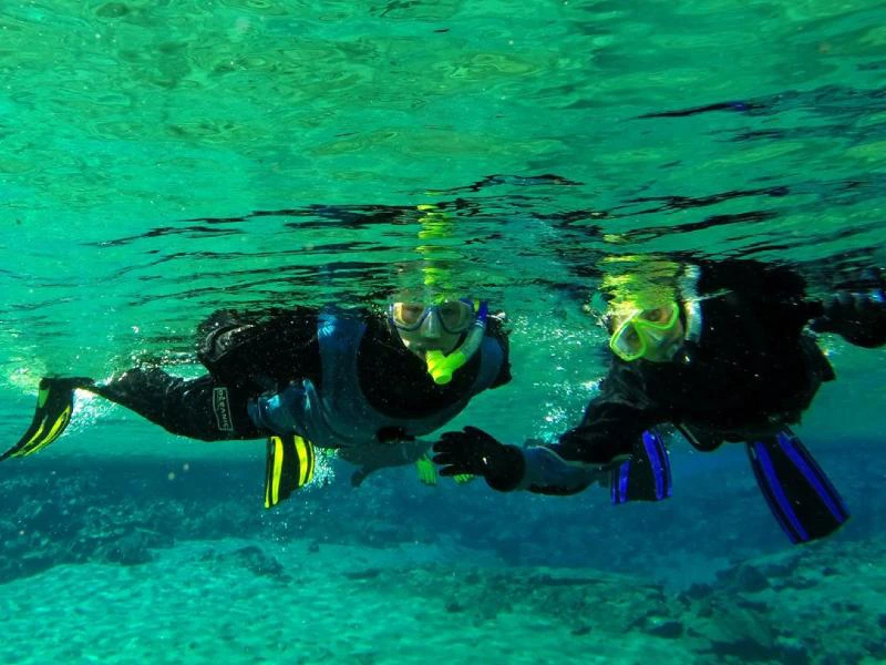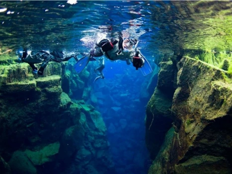 Je twijfelt even maar dan spring je er toch in. Het water tussen de twee continentale platen van Thingvellir Nationaal Park is het hele jaar door rond de 4 graden, maar in je thermopak kun je je ontspannen laten meedrijven met de stroming. In het kristalheldere water kijk je soms wel honderd meter ver naar golvende groene algen en goudgele rotsen. Vaak is een extra overnachting nodig als je voor deze excursie kiest.