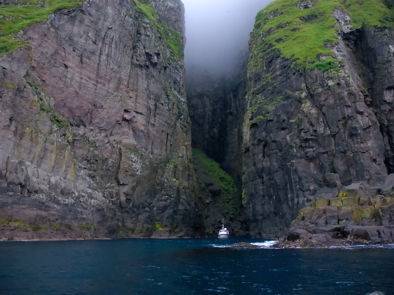 Tijdens deze boottocht vaar je langs steile kliffen en grotten waar duizenden zeevogels nestelen. Vanaf het water zie je de Faeröer van hun ruigste kant: loodrechte rotswanden, schuimende golven en hier een daar een watervallen die in zee storten. Met wat geluk spot je hier van van eind april tot half augustus zelfs papegaaiduikers die vlak boven zee langs scheren. De kapitein manoeuvreert de boot rustig door smalle doorgangen en vertelt onderweg over het landschap en het vogelleven.
