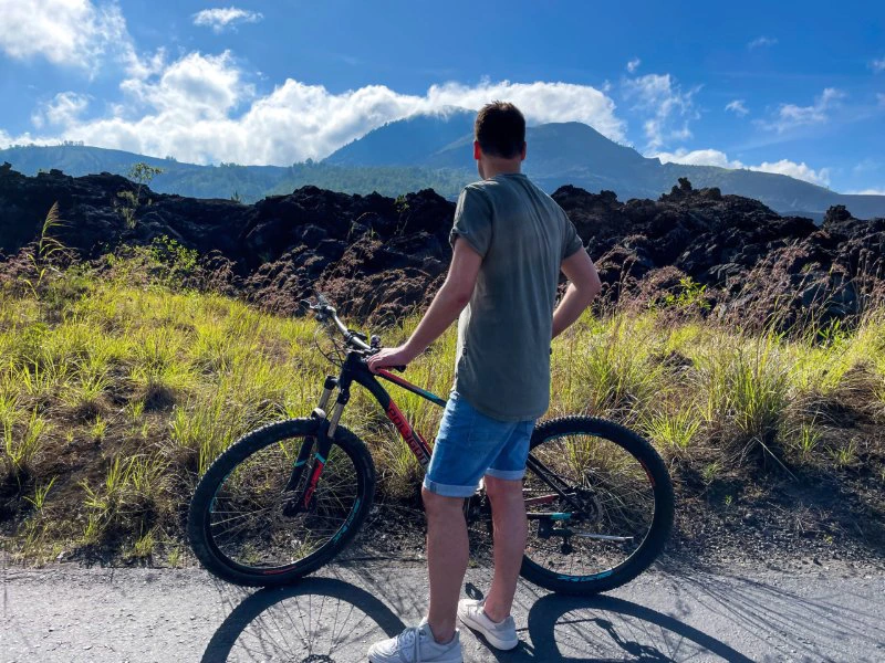Maak je klaar voor een mooie fietstocht per mountainbike door het afwisselende landschap van Kintamani. Je fietst langs groene rijstvelden, kleine dorpjes en tropisch bos, met regelmatig uitzicht op de Batur-vulkaan en het kratermeer. De route gaat over kronkelende paden en lavavelden, waar je de vulkanische omgeving goed kunt zien en voelen.