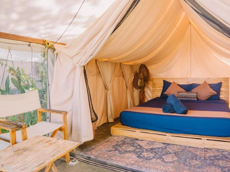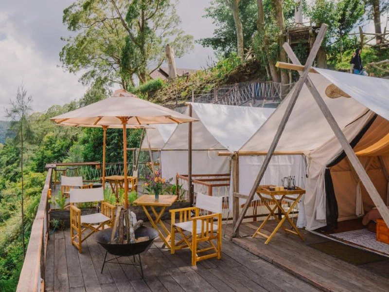 Je laat de drukte van het zuiden achter je en rijdt de bergen van Kintamani in. Onderweg verandert het landschap: de rijstvelden maken plaats voor vulkanisch gesteente en een frissere berglucht. Aan het eind van de middag kom je aan bij je glamping, een eenvoudige tent met alles wat je nodig hebt én een uitzicht recht op de imposante Batur-vulkaan en de zwarte lavavelden. ’s Avonds kruip je met een dekentje op je veranda, terwijl de zon langzaam achter de berg verdwijnt en de eerste sterren verschijnen.