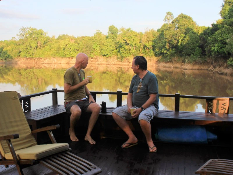 Tijdens het ontbijt zie je het landschap aan je voorbij trekken. Kleine apen slingeren van boom naar boom en kleurrijke vogels fladderen door de takken. Je reist stroomopwaarts naar het eiland Bapallas, ook bekend als “orang-oetaneiland”. Honderden orang-oetans van de Orangutan Survival Foundation leven hier in hun natuurlijke habitat. Vanuit je kano observeer je deze mensapen in hun natuurlijke leefomgeving