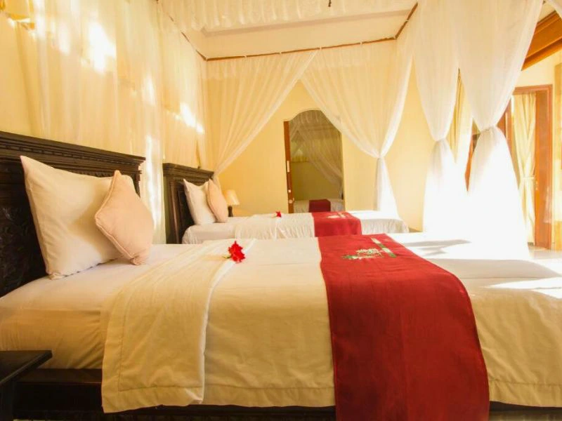 Je verblijft de komende nachten in een sfeervolle bungalow met zwembad op een rustige locatie omgeven door tropische tuinen. Het is een fijne plek om te relaxen met een boekje, weg van de drukte. Via de hotelreceptie regel je gemakkelijk vervoer wanneer je de reuring aan het strand wilt opzoeken, of je gaat zelf op pad en bereikt de kust in circa 30 minuten te voet.