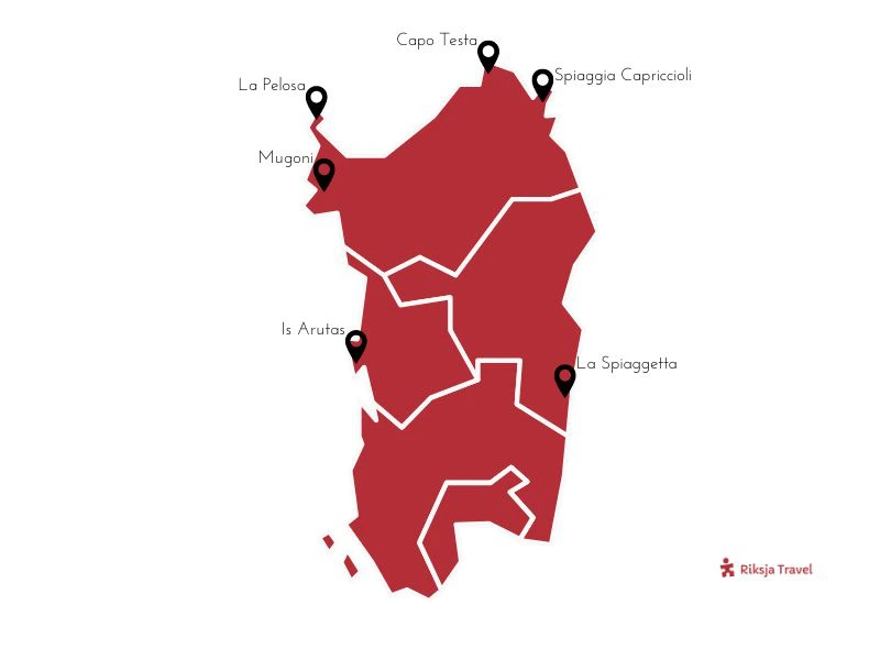 In het westen van Sardinië, op het schiereiland Sinis, ligt een van de mooiste stranden van Sardinië, Spiaggia di Is Arutas. Doordat het water snel zakt naar een paar meters diep, is dit de perfecte plek om te gaan surfen. Ook is het hier minder druk dan de stranden in het zuiden van Sardinië waar de meeste toeristen komen. Een leuke tip is om te fiets te gaan van Cabras naar het schiereiland. Je fietst dan langs kleine witte zandstranden waar je ook kan stoppen om een duik te nemen en fiets je langs flamingo’s.