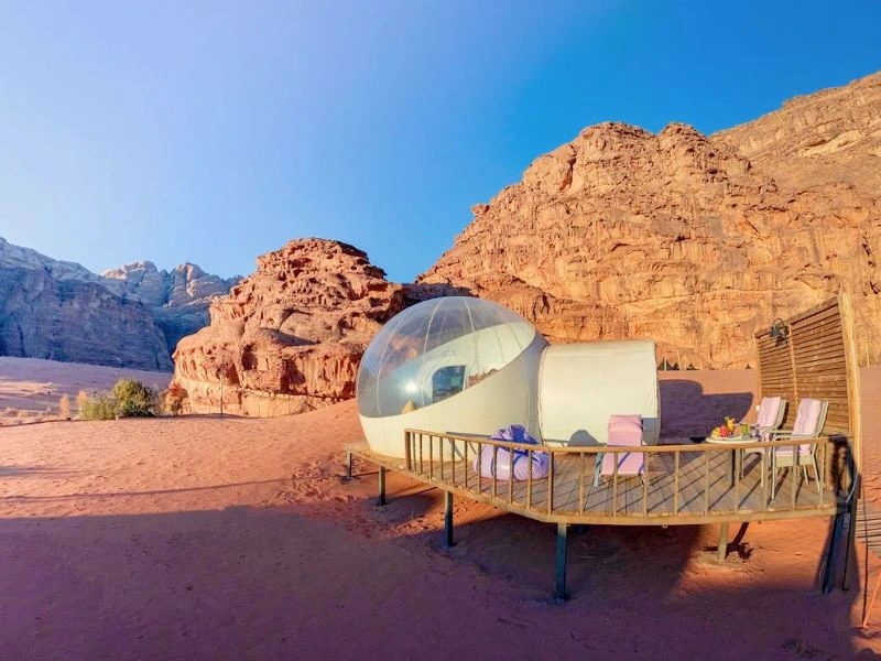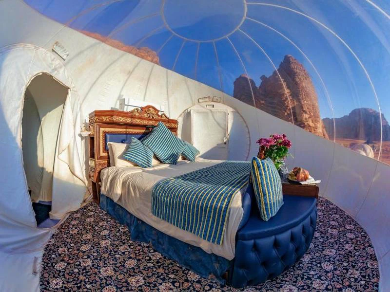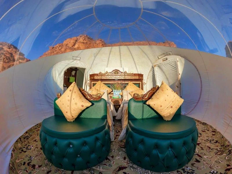Dit maakt je woestijnbeleving af. Je overnacht in een luxe tent, van alle gemakken voorzien (airco, eigen douche en toilet). De plus? Je tent heeft een glazen koepeldak. Vanuit je bed kijk je uit naar de heldere sterrenhemel. Je hebt bovendien een fijne veranda met comfortabele stoelen en loungers om heerlijk in te ontspannen.
