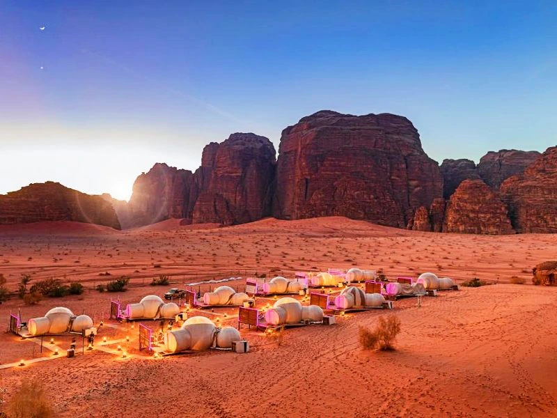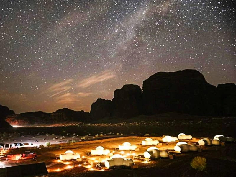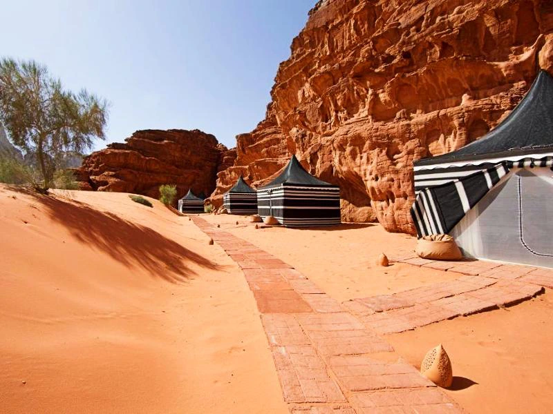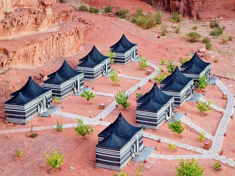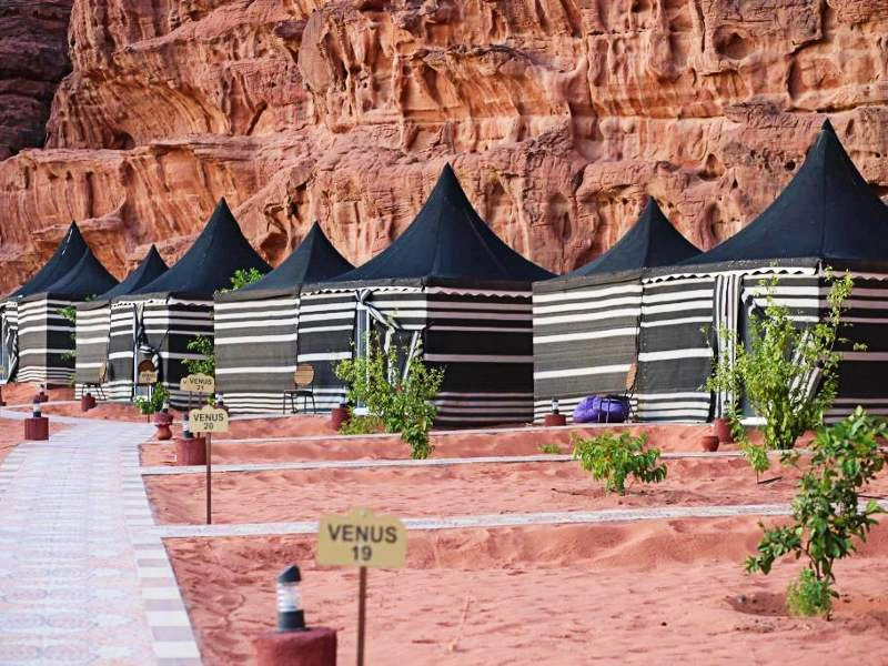 Je overnacht één nacht midden in de woestijn, in een tentenkamp. Dit kamp wordt gerund door twee bedoeïenenstammen die in de Rum-woestijn wonen en het gebied heel goed kennen. Je verblijft in kleine hutten die alleen zijn voorzien van bedden. Kussens en dikke dekens zijn aanwezig, omdat het ’s nachts in de woestijn kan afkoelen. Het kamp heeft een badkamer die wordt gedeeld door overnachtende gasten. De meeste tijd breng je door in de grote tent met open haard, of (bij mooi weer en een heldere nacht) buiten op grote kussens bij het kampvuur. Het eten wordt traditioneel bereid (in het mulle zand, onder de grond) en smaakt verrukkelijk. Na het eten geniet je van de heldere sterrenhemel terwijl de bedoeïenen zingen. Je overnacht ver weg van de grote kampen.
