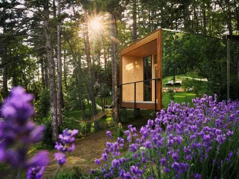 Slaap in een luxe bungalow midden in een dennenbos