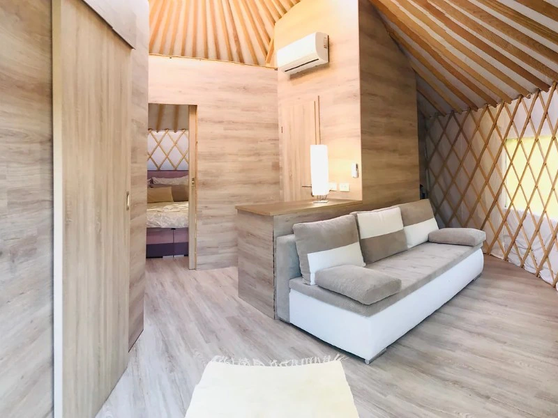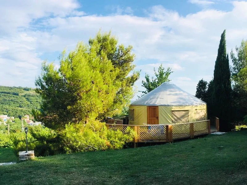In het binnenland vlakbij Piran hebben we een heel bijzonder plekje gevonden. Midden in de natuur, in de schaduw van een aantal eikenbomen staan een aantal ingerichte yurt tenten. Elke tent heeft een zithoek een fijn zitje buiten, een barbecue en een volledig uitgeruste keuken en badkamer. Ook is er een zwembad voor gezamenlijk gebruik. Binnen tien minuten rijden sta je aan zee.