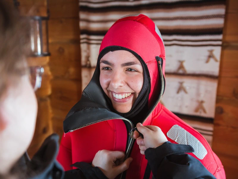 • Er zijn thermopakken beschikbaar vanaf een lengte van 1.20 meter. Veel zwemervaring is niet nodig omdat je met het waterdichte pak in het water dobbert. Toch raden we het ijswakdobberen of voor jonge kinderen zonder zwemdiploma’s.