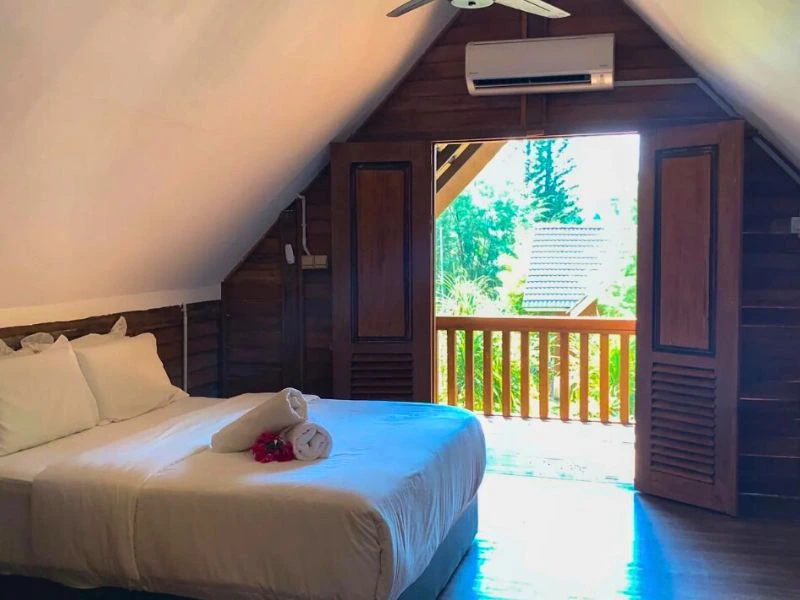 Zodra je aankomt op Pulau Besar, voelt het alsof je een verborgen stukje Maleisië hebt ontdekt. Je verblijft in een eenvoudige maar comfortabele bungalow met airconditioning, verscholen tussen palmbomen. Dit is geen luxe resort met veel faciliteiten, maar juist een plek waar je teruggaat naar de essentie: relaxen aan zee.