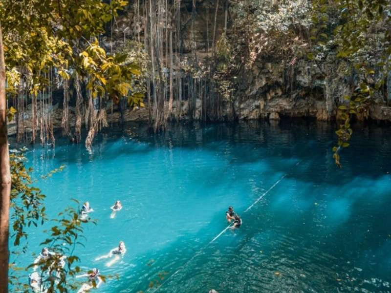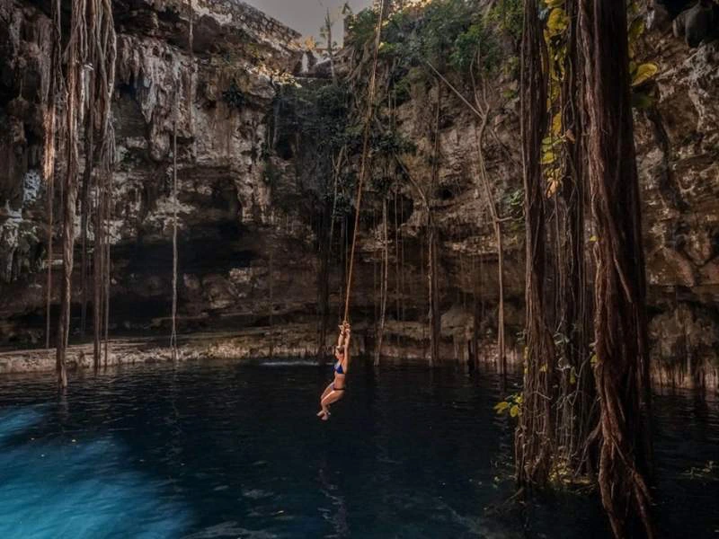 Een van onze favoriete is cenote Oxman. Deze cenote ligt in de buurt van Valladolid en is een van de mooiere cenotes. Dit komt door de lianen die over het water zweven en de lichtblauwe kleur van het zoete water. Iedere cenote heeft wel iets speciaals, net zoals deze. Waan je als een Tarzan en slinger met een touw over het water. Wees extra vroeg om rijen te voorkomen voor het touw slingeren.