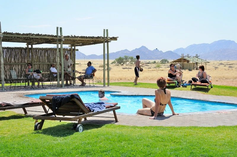 Wij haalden ’s morgens bij de supermarkt wat eten en drinken voor onderweg. Het is een aardig stuk rijden en je komt niet veel tegen onderweg. Je krijgt vandaag al een goed beeld van de enorme uitgestrektheid van Namibië. Het enige noemenswaardige stadje onderweg is Rehoboth, waar je al na negentig kilometer voorbij rijdt. In de middag kom je aan bij onze mooi gelegen en kleinschalige woestijn lodge. Afgezien van enkele peperdure lodges liggen alle accommodaties (waaronder ook onze lodges) in een straal van ongeveer 60 km rondom Sesriem, de toegangspoort naar de Sossusvlei. ’s Avonds smulde wij van een heerlijke ‘farmstyle’ maaltijd met typische Afrikaanse gerechten en groenten uit eigen tuin onder een groot rieten dak.