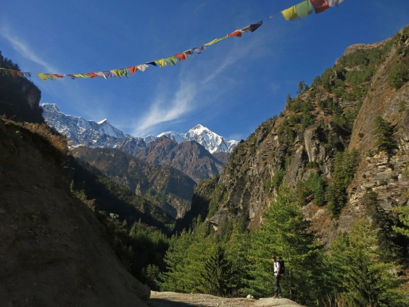 De warme zonnestralen geven Annapurna I een zacht uiterlijk. Met een kop koffie of mountain tea in je hand is het genieten van deze berg. Een machtig gevoel om zo dicht bij een van de 14 bergtoppen van boven de 8.000 meter te zijn. Geniet er nog even van en vervolg de Annapurna Basecamp Trekking met een afdaling van zo’n 1.100 meter in hoogteverschil. Onderweg neem je langzaam afscheid van de panoramische uitzichten over de bergen. Afdalen klinkt eenvoudig, maar veel trekkers vinden dit lastiger dan klimmen. Heb je snel last van gewrichten, overweeg dan een goed paar (inschuifbare) wandelstokken. Hiermee verdeel je schokken over meerdere gewrichten en krijg je over het algemeen minder last van je knieën en/of heupen. Tijdens het lopen verdwijn je gestaag tussen de rododendron-en bamboebossen. Bij helder weer heb je vanuit Deurali nog steeds een super uitzicht op de bergtoppen.