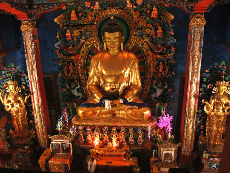 Wanneer je de ceremonie van gisteren hebt gemist of nogmaals dit wilt bijwonen, sta dan heel vroeg op. Nog voor zonsopgang schallen de toeters, bekkens en drums door het klooster en zie je de grote gouden Boeddha steeds meer in het licht tevoorschijn komen.