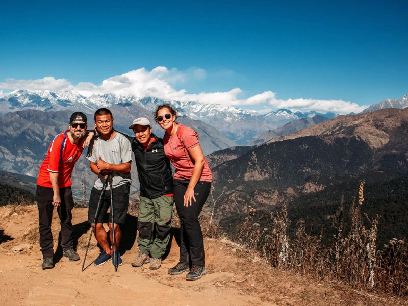 Na het ontbijt word je door onze chauffeur opgehaald en rijd je in ongeveer een uur naar het dorpje Birethanti. Tijdens de rit zie je de eerste hoge bergen van de Himalaya tevoorschijn komen en kronkelt de weg omhoog naar het beginpunt. Met je dagrugzak op en vergezeld door je gids en de lokale dragers begint de trekking op een breed pad. Uitgezwaaid door de dorpelingen loop je langzaam omhoog.