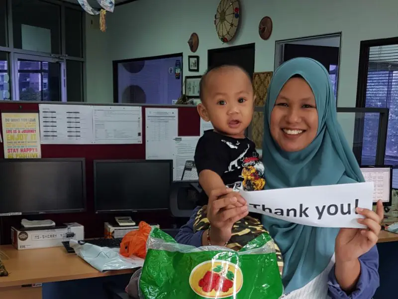 Aishah is moeder van een zoontje van 1 jaar, hij werd geboren net voor de coronacrisis uitbrak. Een heftige tijd voor haar. Als kantoormedewerkster raakte ze vlak daarna haar baan kwijt en zit ze samen met haar man en zoontje al bijna een jaar zonder inkomen thuis. Het is bijzonder om te zien hoe positief zij blijft en blijft lachen. Met onze steun hebben zij en haar collega’s een uitgebreid voedselpakket ontvangen, waar zij twee weken mee vooruit kunnen. Voor slechts 10 euro wordt dit pakket samengesteld met onder andere rijst, eieren, kookolie, melk en kruiden.