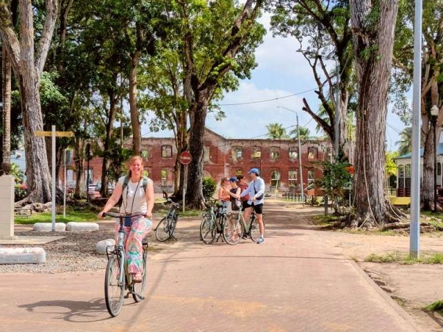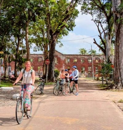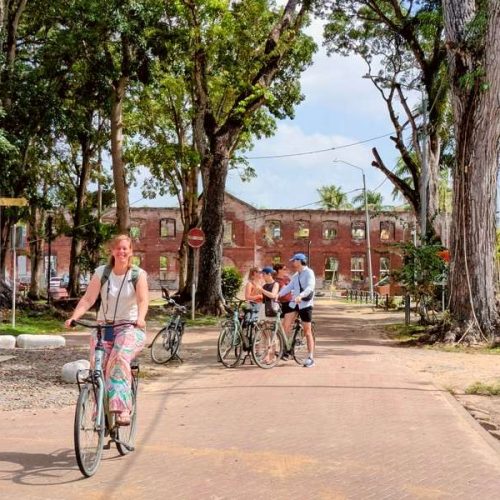 Op je tweede dag in Paramaribo ontdek je de stad per fiets, samen met een lokale gids. Je rijdt door het overzichtelijke centrum en door wijken waar je anders niet snel komt. Onderweg valt meteen op hoe anders Paramaribo aanvoelt dan veel andere hoofdsteden, met een compact centrum en houten huizen in koloniale stijl in plaats van hoge gebouwen. Je fietst langs Fort Zeelandia, een plek die nauw verbonden is met de koloniale tijd en de geschiedenis van de slavernij, en over de Waterkant met uitzicht op de Surinamerivier. Hier zagen wij zelfs de grootste kaaiman van de hele reis langs de oever liggen. Er is tussendoor genoeg tijd voor een drankje en ruimte om vragen te stellen, terwijl je meer hoort over de geschiedenis, culturen en het leven in de stad.