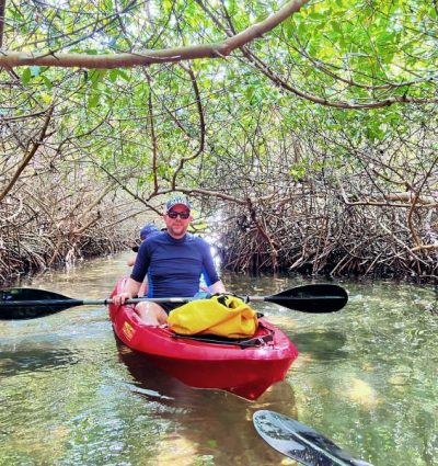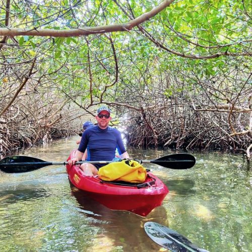 Na het ontbijt word je opgehaald en naar het mangrovecenter gebracht, waar de gids al op je staat te wachten. Stap in een felgekleurde kajak en zodra je de slag te pakken hebt, peddel je in een kleine groep 2 uur door de schitterende natuur. Trek je zwemkleding van te voren vast aan, want met een beetje geluk is er tussendoor ook tijd om te snorkelen. Vergeet je ook niet in te smeren met zonnebrandcrème, want op het water verbrand je snel. Wij zagen de meest kleurrijke visjes door krioelende wortels in het ondiepe water spartelen.