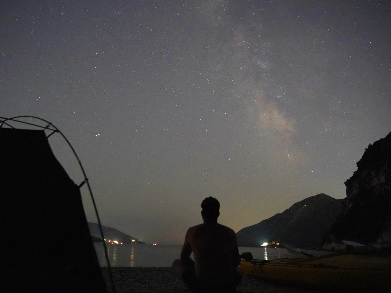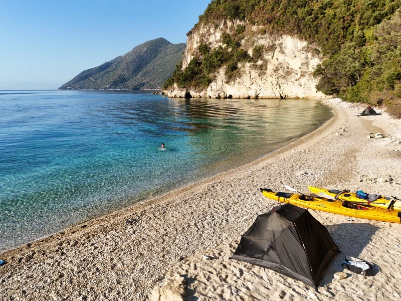 Aan het einde van de middag, na circa 10 km peddelen, kom je aan bij het kiezelstrandje op het eiland Meganisi waar je zult overnachten. Meganisi ligt voor de kust van Nydri en is een onbewoond eiland. Verborgen baaien, een groen en heuvelachtig binnenland en een kristalheldere zee, dat is Meganisi. Samen met de gids zet je het kamp op en sprokkel je hout voor het kampvuur. Terwijl de gids de barbecue voorbereidt kun jij de omgeving verkennen. Tip: neem een vishengeltje mee, met wat geluk vang je wat en kun je dat meteen klaarmaken op de grill. Na het eten geniet je van het kampvuur (als er op dat moment geen vuurverbod is) en een hemel vol sterren. Moe maar voldaan kruip je vervolgens in je slaapzak en val je met het geluid van het kabbelende water op de achtergrond in slaap.