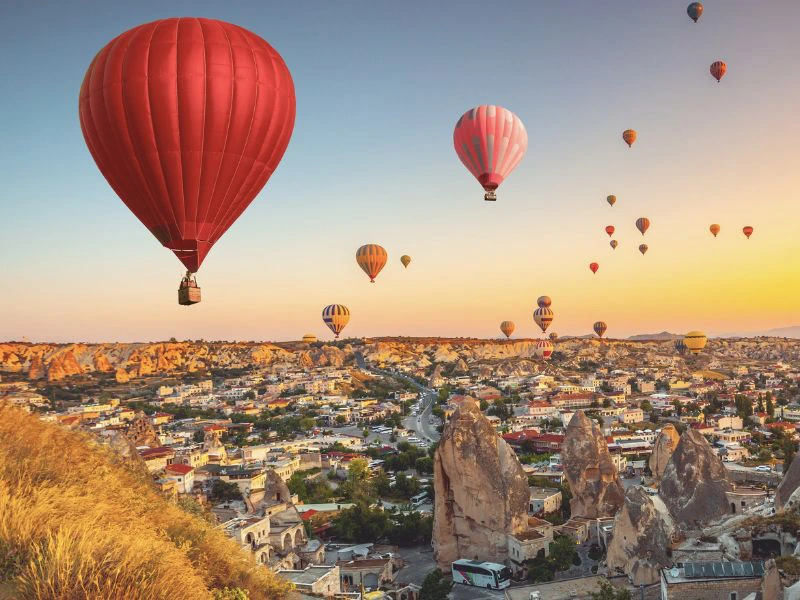 Vroeg in de ochtend word je opgehaald voor een onvergetelijke ervaring: een luchtballonvaart boven Cappadocië. Terwijl de eerste lichtstralen de valleien raken, stijgen tientallen kleurrijke ballonnen op. Vanuit de lucht heb je een adembenemend uitzicht over de rotsformaties, grotwoningen en de valleien die in zachte pastelkleuren oplichten. De stilte daarboven is indrukwekkend, alleen het zachte geluid van de brander doorbreekt de rust. Het landschap verandert voortdurend van tint: van roze en goud naar warm oranje. Na de landing wordt er vaak geproost met een glas bubbels of sap, een mooi moment om deze bijzondere ervaring te vieren.