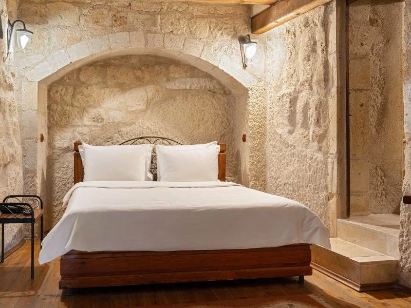 Tussen de rotsformaties en mysterieuze valleien van Cappadocië vind je een kleinschalig grothotel waar je de komende nachten slaapt. Deze regio, gevormd door eeuwenoude vulkaanuitbarstingen, staat bekend om haar sprookjesachtige landschap vol pieken, tufsteenrotsen en verborgen grotwoningen. Je slaapt in een sfeervolle kamer uitgehouwen in het gesteente, eenvoudig maar comfortabel, met een warme en authentieke uitstraling. Op het terras geniet je van een glas lokale wijn terwijl de zon achter de heuvels zakt en de vallei in roze en koperkleuren kleurt. ’s Avonds wandel je door het dorp, waar de geur van houtvuur en versgebakken brood hangt. In een klein restaurant proef je Anatolische gerechten: kruidige stoofpotten, mezze en yoghurt met munt.