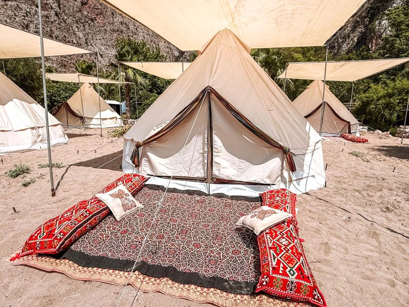 Overnacht in een eenvoudige glamping tent in de spectaculaire Butterfly Valley, verscholen tussen steile kliffen en bereikbaar via een korte boottocht vanaf Ölüdeniz. Deze plek draait om de ervaring: wakker worden tussen het geluid van de zee en vogels, wandelen naar verborgen watervallen en zwemmen in helder turquoise water. Het gebied is beroemd om zijn indrukwekkende natuur en de zeldzame vlinders. Verwacht geen luxe sanitair; de charme van Butterfly Valley zit juist in de eenvoud en de directe connectie met de natuur. Overdag kun je kajakken, snorkelen of een wandeling maken langs de kliffen, ‘s avonds geniet je van lokale gerechten onder een sterrenhemel. De prijs van de boottocht richting de Butterfly Valley is ongeveer €6,00 per persoon retour en betaal je bij de boot.