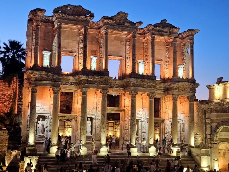 In Efeze, op zo’n anderhalf uur rijden van Urla, stap je terug in de tijd. Samen met een lokale gids wandel je over geplaveide straten, langs marmeren zuilen, tempels en badhuizen. In het enorme theater waar ooit 25.000 toeschouwers bijeenkwamen voel je nog de echo’s van het verleden. De gids vertelt over het dagelijks leven van de Romeinen, over handelaren en pelgrims, over goden en machtige families. Bij de Bibliotheek van Celsus en de Tempel van Artemis ontdek je waarom Efeze ooit het hart van Klein-Azië was. De huizen met mozaïeken en fresco’s tonen hoe rijk en verfijnd de stad moet zijn geweest. Na je bezoek rijd je verder naar het rustige Bafa-meer, een plek waar de tijd lijkt stil te staan. Je slaapt hier de komende nachten in een eenvoudige, charmante accommodatie aan het water, omringd door olijfgaarden en groene heuvels. De geur van huisgemaakt eten vult de avondlucht, terwijl de zon achter het meer zakt.