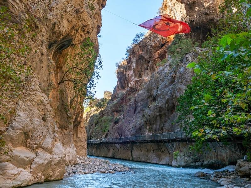 De dag begint actief: je trekt je wandelschoenen aan voor een tocht door de Saklıkent Kloof, een van de diepste kloven van Turkije. De wanden rijzen tot wel 300 meter hoog, en tussen de rotsen stroomt helder smeltwater. In de zomer staat het water laag en wandel je deels door het rivierbed, terwijl je over gladde stenen klautert en smalle houten bruggetjes oversteekt. Elke bocht in het pad onthult een nieuw uitzicht: steile rotswanden, kleine watervallen en het glinsterende licht dat naar binnen valt. Het is een tocht vol afwisseling: rustig wandelen, af en toe klimmen, en vooral genieten van de stilte en de koelte van de kloof. Neem je zwemkleding mee voor een verfrissende plons in het koude bergwater en sluit de dag af met een maaltijd bij een lokaal eethuis langs de rivier.