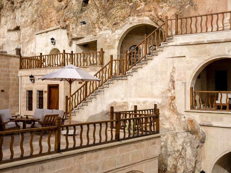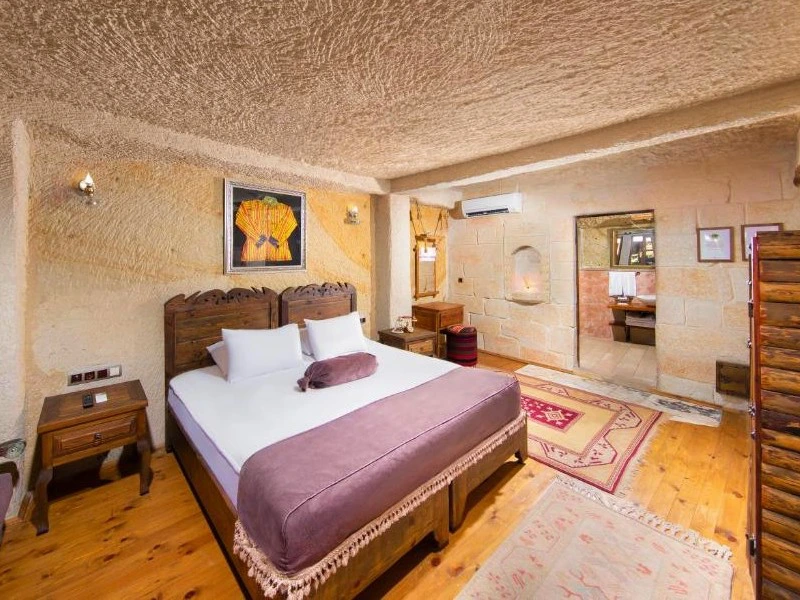 Tussen de golvende valleien en indrukwekkende rotsformaties van Cappadocië overnacht je in een sfeervol grothotel. Geen standaardkamer, maar een kamer die letterlijk in het zachte tufsteen is uitgehouwen. De gewelfde plafonds en warme verlichting zorgen voor een unieke, bijna sprookjesachtige sfeer. Op het terras drink je een glas lokale wijn terwijl de zon langzaam achter de heuvels verdwijnt en het landschap verandert in zachte roze en oranje tinten. ’s Ochtends begint de dag rustig, met een ontbijt van vers brood, olijven en lokale kazen. Terwijl je geniet van het uitzicht, stijgen de eerste luchtballonnen op boven het dal, een magisch gezicht dat je niet snel vergeet.