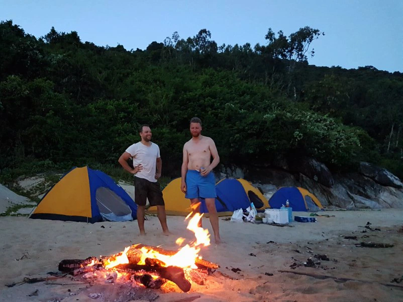 Later op de middag, als de dagjesmensen terugkeren naar het vaste land en de zon wat minder fel begint te schijnen, keer je terug naar het hoofdeiland Cham-eiland. Op het uiteinde van een van de mooiste stranden op het eiland bouw je vervolgens het kamp op. Een heerlijk rustig plekje, maar met het voordeel dat je op een paar minuten lopen toch gebruik kunt maken van de sanitaire voorzieningen die er voor de dagjesmensen zijn neergezet. Helaas hebben ze ook hier last van plastic afval dat aanspoelt, dus voordat we de tenten opzetten houden we eerst een grondige beach cleanup. Zodra de zon in de zee is gezakt, is het tijd om het vuur aan te steken en te barbecueën. ’s Avonds deel je verhalen rond het kampvuur en kijk je uit over een hemel vol sterren. Moe maar voldaan, duik je je tent in.