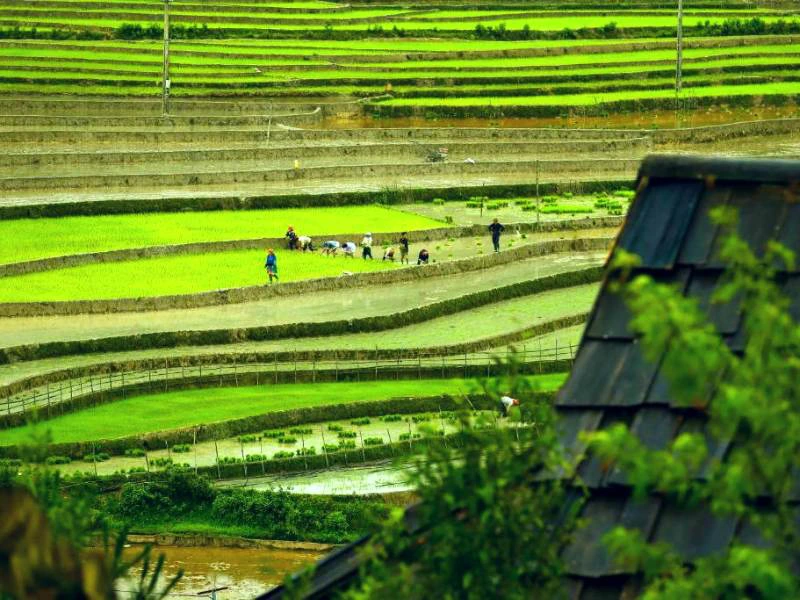 Na het ontbijt ga je te voet op pad. Samen met je gids wandel je langs terrassen waar water zacht naar beneden stroomt en waar je mensen ziet werken met manden en gereedschap. De paden zijn smal; af en toe sta je met één voet in het rijstveld om iemand te laten passeren. Kinderen spelen met modder, waterbuffels sjokken af en aan en in de dorpen hoor je stemmen uit huizen op palen. Tijdens je wandeling kom je langs plekken waar Hmong‑ en Thai‑families hun dagelijkse werk doen. Ongeveer 300 jaar geleden zijn de Hmong vanuit China naar deze regio gevlucht; ze vormen ongeveer 90 % van de totale bevolking in Mu Cang Chai.